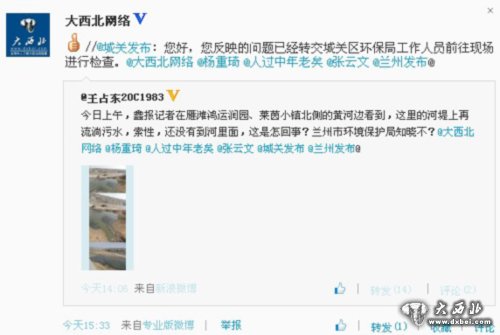 昨日下午,兰州市城关区官方微博 @城关发布向记者回应说:“您好,您反映的问题已经转交城关区环保局工作人员前往现场进行检查。”