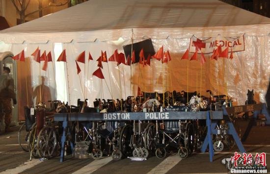 当地时间4月15日,美国波士顿爆炸案现场被警方严密封锁。正在进行马拉松比赛的波士顿当天下午发生爆炸事件,现已造成百余人伤亡。图为设在现场的医疗救助点,起初用于马拉松比赛,其后被用于救助爆炸案中的伤者。中新社发 李洋 摄