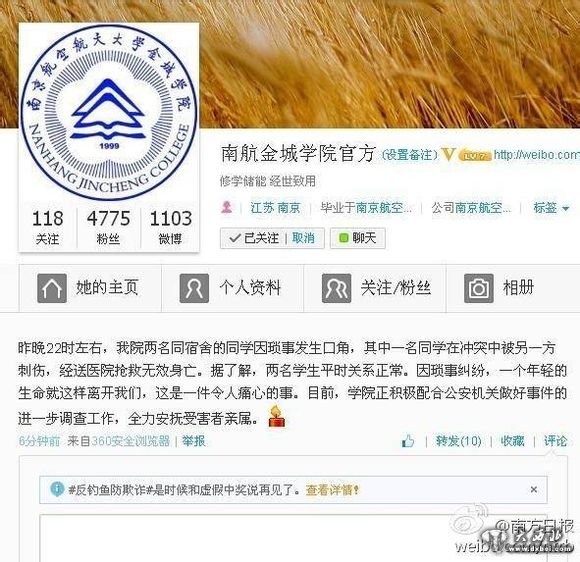 17日,南京航空航天大学金城学院在其官方微博中发表声明:昨晚22时左右,该院两名同宿舍的同学因琐事发生口角,其中一名同学在冲突中被另一方刺伤,经送医院抢救无效身亡。据了解,两名学生平时关系正常。因琐事纠纷,一个年轻的生命就这样离开我们,这是一件令人痛心的事。目前,学院正积极配合公安机关做好事件的进一步调查工作,全力安抚受害者亲属。