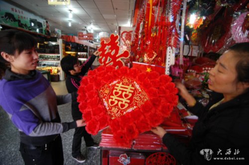 各大商家早早开始准备,挖空心思,想尽新招来“掘金”。记者在义乌商贸城看到,购买婚庆用品的人陡然上升,商场的人流量也比平日增加了许多。记者观察到,无论在大商场还是在街头,人潮涌动,手拎大包小包的情侣着实不少。在义乌商贸城里,记者碰到了手里拎着大包小包的王先生,他告诉记者,他和女友相恋2年,五一就要举办婚礼了,可能是心情好的缘故吧,反正来到商城里,只要看中了就买下来了。在义乌商贸城一楼批发婚庆用品店记者看到,购买胸花、请贴、糖盒等婚礼用品的顾客络绎不绝。据一位商户向记者透露,她的婚礼用品销售额比去年同期增加了3000多元。