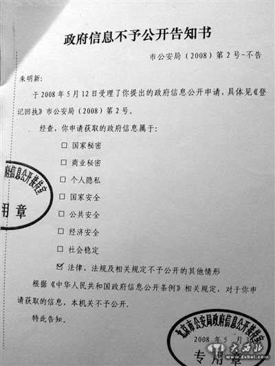 当年5月30日,市公安局以“法律、法规及相关规定不予公开的其他情形”为由,对此申请发出“政府信息不予公开告知书”。