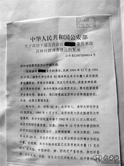 直到一次偶然的机会,他从朋友那看到了公安部办公厅关于一份政协提案的回复函(2007年9月17日发)。政协十届五次会议召开之际,曾有政协委员上交有关朱令的提案,希望抓紧破案并妥善处理。