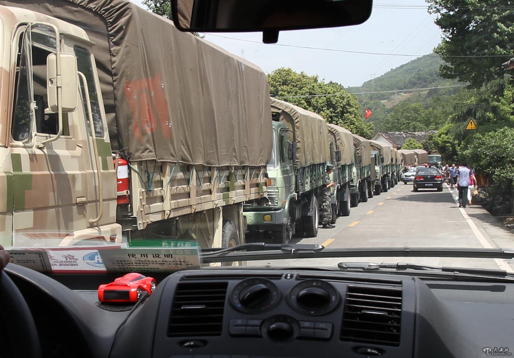 4月20日,离雅安市芦山县震源不足20多公里处的邛崃市高何镇靖口村,救援车辆在整装准备前往救援。