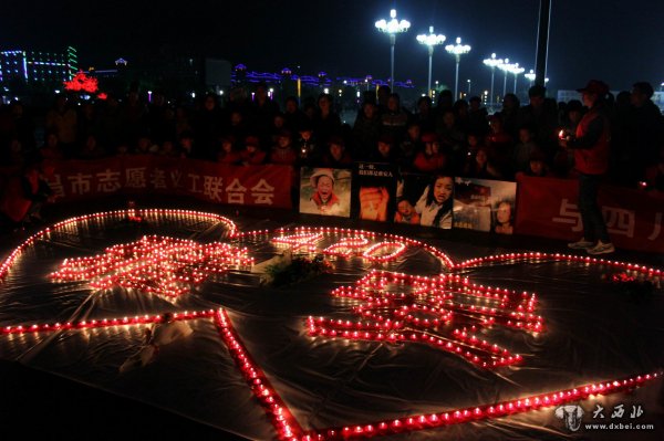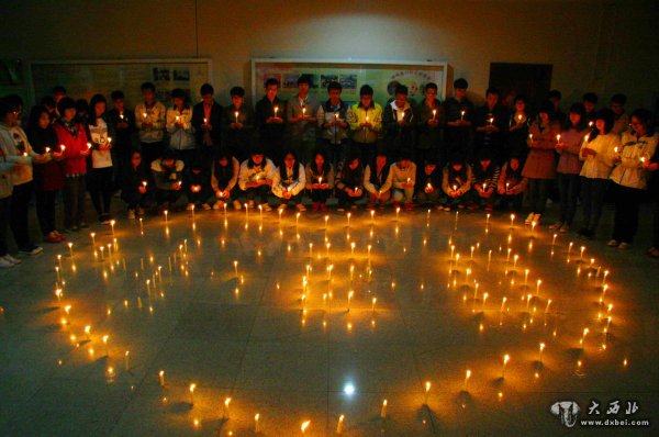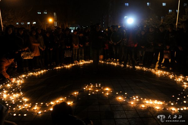 4月20日,吉林大学的学生们用蜡烛排成了一个“心”形,为地震灾区人民祈福。