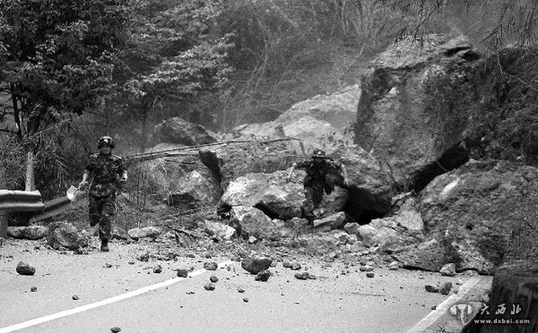 由于道路不通,记者一行辗转来到芦(山)灵(关)路,这是通往宝兴县的另一条通道。一路上,看到大批官兵前往抢险救灾。车行约7公里,来到大岩腔电站附近,周围山体塌方十分严重,路基完全被毁,滚落在道路上的巨石比餐桌还大。据当地群众介绍,这段路上,类似这样严重的塌方点还有两处。