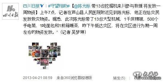 大西北网4月21日讯 #守望相助#【@陈光标带13台挖掘机来川参与救援 将发放一周物资】上午7点,记者在芦山县人民医院附近见到陈光标,他正在给灾民发放救灾物资。据悉,此次陈光标带了13台大型机械,1千床棉被,500个手电筒,1吨面包和1前箱暖茶,昨下午抵达灾区,将在灾区进行为期一周左右的物资发放。“(记者 吴梦琳)