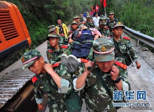 4月21日,武警四川总队第一支队七中队的战士在宝盛乡抢救一名村民。 “4·20”芦山地震发生后,芦山县宝盛乡受灾严重。目前,救援队员仍在搜救伤员、抢通道路和抓紧恢复通讯中。 新华社记者 肖艺九 摄