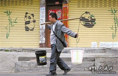 一名居民挑着水桶去接干净的饮用水。