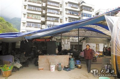 这是靠近宝兴县城的一个老小区,住的大多数是林业局的退休人员。住户互相熟悉,地震来的时候,看着房子被扯开了拇指宽的缝,他们知道房子住不得了。在这个废弃的汽车修理厂,居民们开始了灾后生活。中年男人做体力活,老人互相照应,女人出门找食物。