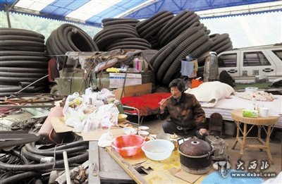 废弃的修理厂里堆满了大的货车轮胎和各种杂物,大家的床就放在轮胎旁边。垒了一个灶,所有人从家里拿出来的粮食、菜和各种调料都一起用。共同买了煤气和蜂窝煤。这个暂时的大家庭成立了。