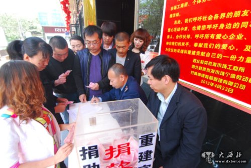 据西北鞋类批发市场工商所所长李航称,地震发生后辖区商户就跑到工商所主动提出为四川雅安灾民进行爱心捐款,随后我们向兰州市工商局城关分局请示,得到上级领导批准后,开展捐款活动并分别设立了西北鞋城、西北鞋类市场、鞋乐汇以及锦绣鞋都四个募捐会场,向灾区人民伸出援助之手,仅在短短的一个小时内,锦绣鞋都商户就募捐到1.9万元,这些善款将交到区个体劳动者协会,由该协会送到雅安灾区。