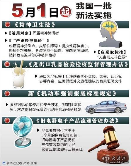 自今年5月1日起,从中央到地方一批法律法规开始实施。从1985年启动该项立法工作算起,到2012年终获通过,《精神卫生法》整整走过了27个年头,终于在今年5月1日将正式施行。《精神卫生法》明确了非自愿医疗的概念、标准和程序等,不少媒体称之为“被精神病”的终结。以政府令形式公布的《西安市行政程序规定》,2013年5月1日起将在西安市正式实施,这部旨在规范政府行政执法活动、保障公民合法权益的政府规章,因“偷拍窃听取得证据无效”、“执法人员无证可被当事人拒绝执法”等新规定,备受市民关注。