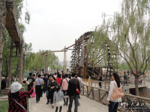 许多人来到园内发现,往日相对宽松、安静的景区,在今年五一一下子变得热闹起来了!园区蜿蜒伸展的观览道上,处处是游人的身影,连景区内跨越南河道取水口上方的握桥上,都是游客来往的风景。而在园区段续塑像前的喷泉广场上,在缓慢转动的巨型水车旁,在展示兰州老水磨坊的房子前,早已围满了游人。尤其在园区内几个袖珍水车模型前,许多家长带着孩子来到跟前,让孩子现场动手转动水车,并在一旁为孩子拍下游乐的画面,一片温馨闲适的景象。