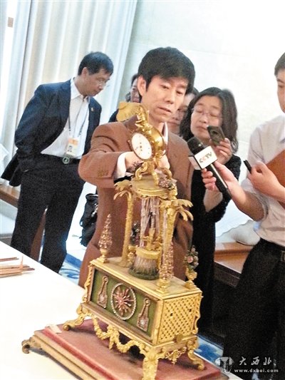 昨日,故宫博物院宫廷部研究员郭福祥介绍清代铜镀金转花水法人打钟受损情况。新华社记者廖翊摄
