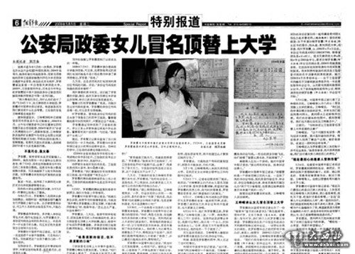 她把这个线索给了《中国青年报》。很快,本报发表了记者白皓采写的《谁冒名顶替我上了大学》。