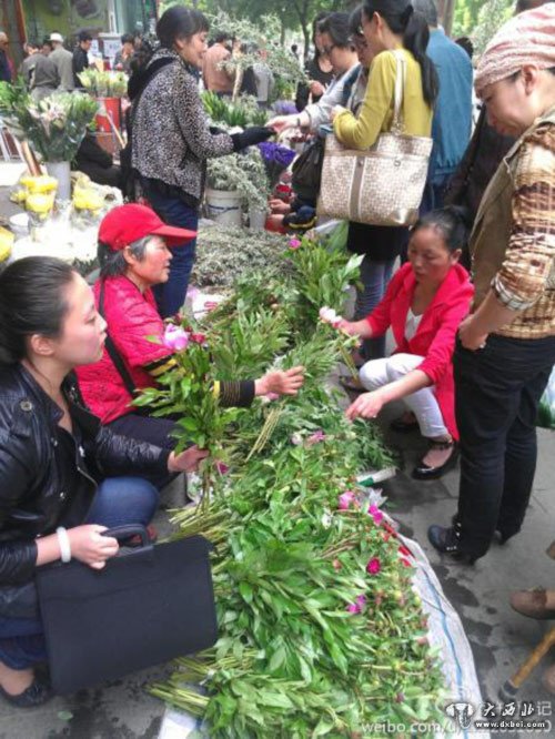 然而,不光只有沙枣花“独领风骚”,一旁的带着露珠的牡丹也显得非常惊艳,含苞待放的花蕾造型各异的牡丹,在绿叶的衬托下,朵朵不失妩媚,孤傲不失朴实,在清晨媚阳光照耀下,折射着迷人魂魄的艳丽色彩。据销售牡丹花的商贩介绍,她出售的散装牡丹花,都是自家苗圃里种植的,有些花已经快开了,就剪接了些来这里出售。“我每年都会在这个季节挑些散牡丹,放到有水的花瓶里,等待它的开放,含苞待放的花骨朵儿一旦完全绽放,颜色各异,香气扑鼻,能让人有一种愉悦的感觉。”市民刘女士边挑选花边对记者说。