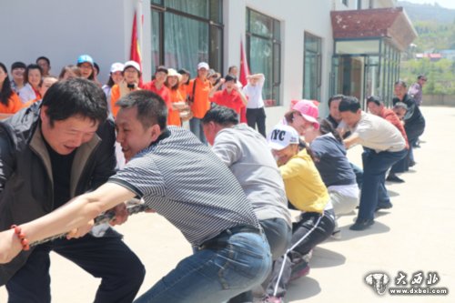 两只代表队体形相当,这势必会是一场势均力敌的恶战呀,经过首轮较量三江源代表队以微弱的优势胜了一局,现在交换场地后两边队员已站好位置,大家都是手交叉着手,脚抵着脚,把重心放得很低,工商所代表队的队尾还把绳绑到了自己身上,以获得更大的力量。比赛一开始两边啦啦队加油声如雷贯耳,队员们也是马足了劲,有咬紧牙的,有张大嘴的,有皱着眉的,僵持不多时三江源已经占据优势,红绳缓缓地向他们移去,大约差十厘米的时候,突然三江源似乎松了一口气,工商所一鼓作气扭转了比赛的局面,打成了平手。