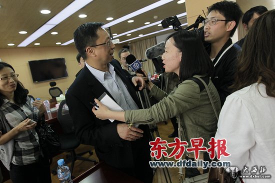5月7日下午,上海市人大食品安全社会监督机制建设专题调研会后,记者采访市食安办主任阎祖强。早报记者 高剑平 图