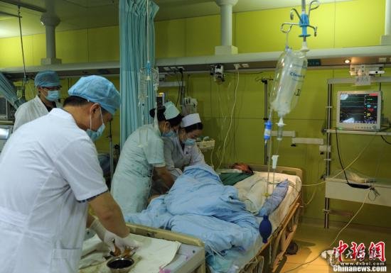 5月12日,四川泸县桃子沟煤矿“5.11”瓦斯事故中的伤员救治工作正紧张进行中,18名伤者得到妥善救治。该起瓦斯事故已造成28人遇难,有80人生还。目前,出事矿井相关负责人已被警方控制,事故调查工作正在紧张进行中。图为泸州医学院附属医院ICU重症监护病房的医护人员正在抢救事故中的重伤者。中新社发 刘忠俊 摄