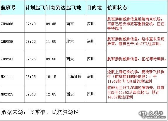 15日8时至8时33分,深航南京、西安、北京分别接到关于ZH9866航班、ZH9243航班、ZH9889航班的威胁信息;东航的MU2325航班(兰州飞西安)、吉祥航空公司的HO1111航班(上海虹桥飞深圳)当日上午也分别接到电话恐怖威胁信息。