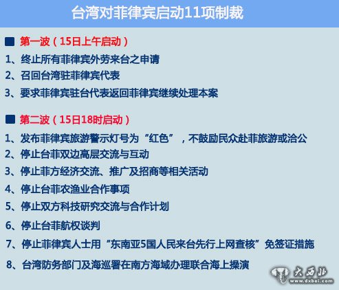 昨天18时,江宜桦举行记者会,宣布立即启动对菲律宾第二波制裁措施,内容包括不鼓励台湾民众赴菲旅游、停止高层次交流与互动、停止经济交流和招商活动、停止农渔业合作等。