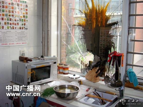 业主代表家中玻璃被砸,被波油漆(记者白宇 摄)