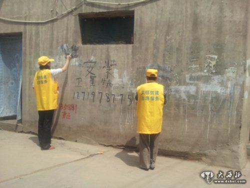 在该家属院大门内两侧的墙体上写满了各种小广告,有安装卫星锅的,有办证的,有疏通下水的......总之是应有尽有。两位身穿黄马夹的志愿者正提着小桶,挥着刷子刷写在墙体上的各类小广告。“刚开始刷残标的时候,每天从早上8点开始刷,一直到中午,几个小时下来脖子疼,胳膊困。但刚铲完的地方人家们又贴上了,看着越铲越多的小广告,我们恨的咬牙切齿,也没有办法,只能下午接着再铲再刷。现在,我们也已经适应了,在没有根治的办法时,我们只能天天提着桶子,拿着刷子和铲刀走街串巷,走哪铲哪,走哪恻哪。”正在刷小广告的段女士说。