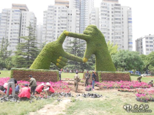 昨日,在兰州水车博览园门前绿地上,园林工人正在一座绿雕下摆放盆花。为迎接马拉松,兰州东方红广场、天水路、老年公园、南滨河路等地方,园林工人正忙着为金城“梳妆打扮”,以优美、喜庆的城市环境,迎接马拉松比赛。