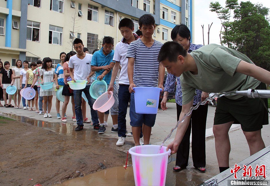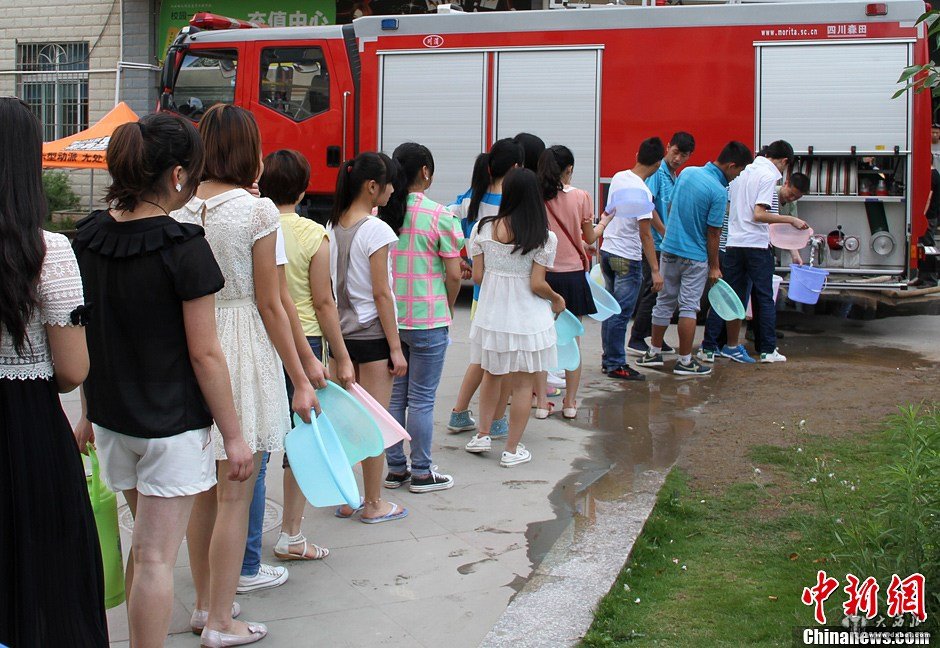 5月27日,流经四川广元境内的嘉陵江受上游水电站泄洪排沙影响,导致当地水厂停水,上万人出现饮水困难。当地消防部队紧急派出大型水罐车为学校、医院、小区、福利院等居民集中区域送水解眉燃之急。图为排队打水的民众。 中新社发 刘忠俊组稿
