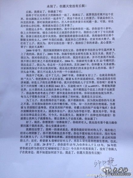 在微博中,记者看到一张用A4纸打印的遗书。上面写道:“丘挺,我走了,你满意了吧!”跳楼女子娓娓道出了在这16年的婚姻里,她曾花钱供他读书,看着他步步高升,又看着作为教授的他,多次与与多位女学生发生关系,千万别墅、百万途锐……还有太多说不清楚的,称自己已被一步步逼上绝路,只求丘挺可以善待儿子。