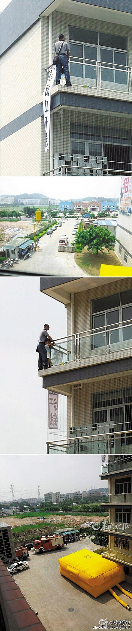 据目击者黄小姐介绍,她在该工业园区上班,昨日上午差不多10时,突然发现一名男子走到了5楼围栏外,作势要跳楼,“不看不知道,一看吓一跳啊!那名男子跨出围栏,半个身子悬空在外。最要命的是,他竟然带着一个小女孩跟他一起跳”!