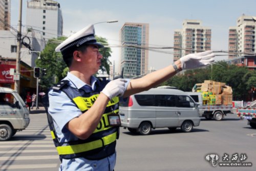 牛有江就站在十字西侧路口的中间,尽管车流不大,且有信号灯指挥,但当信号灯亮起时,他还是很规范地作出一系列指挥手势。一个手势打完,他忍不住抬起胳膊擦了一下眉间的汗水。