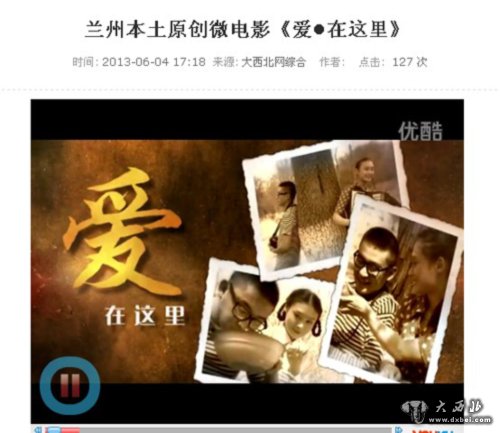 大西北网6月5日讯 据鑫报报道: 记者获悉, 投资10余万,由中共兰州市委政法委员会和兰州市社会管理综合治理委员会联合出品的我省首部政务微电影《爱·在这里》日前正式上映。市民可登录大西北网视频频道http://www.dxbei.com/n/20130604/wdy.html观看。