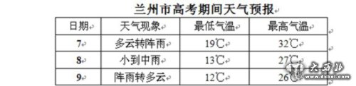 鑫报讯 昨日,甘肃省气象局发布2013年甘肃省高考天气预报:高考期间,我省张掖以东大部分地方有降水,部分地方雨量较大,气温正常。请考生注意收听当地天气预报,合理安排赴考时间,并注意交通安全。
