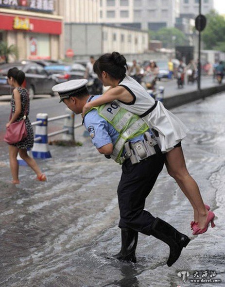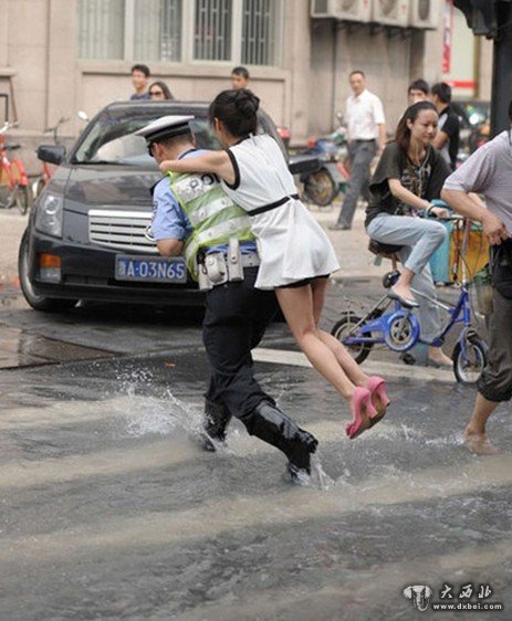 6月4日,杭州市朝晖路深蓝广场附近一条自来水管爆裂,积水漫过了车道,挡住了不少人的去路。一位在这里执勤的交警背着一位女性路人趟过积水,让人大呼“有爱”。也有网友笑称,“背得太保守了”。董旭明 摄 图片来源:CFP视觉中国
