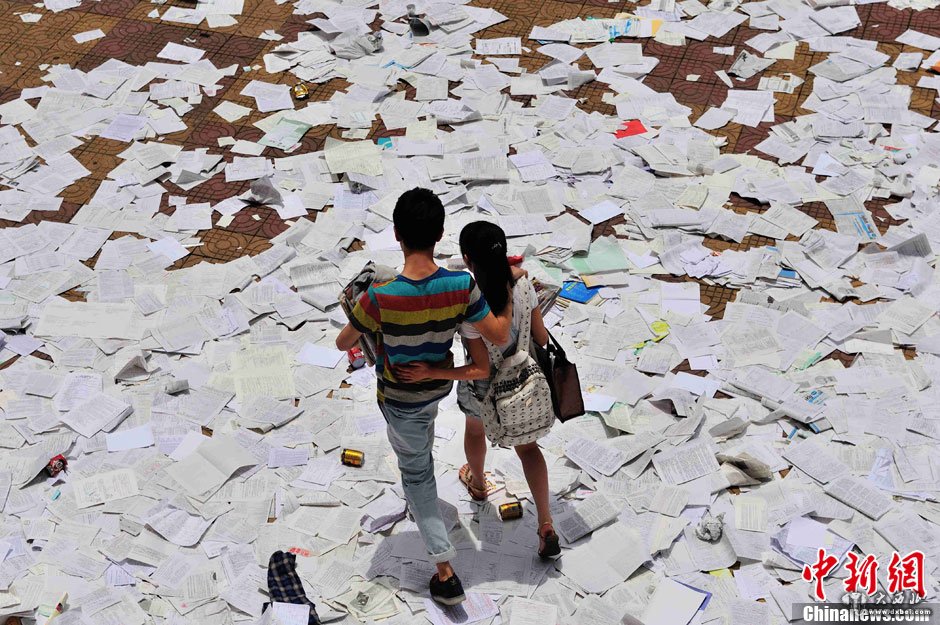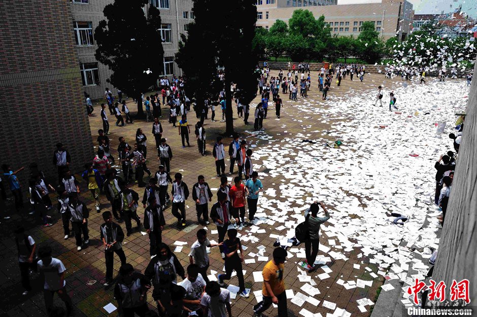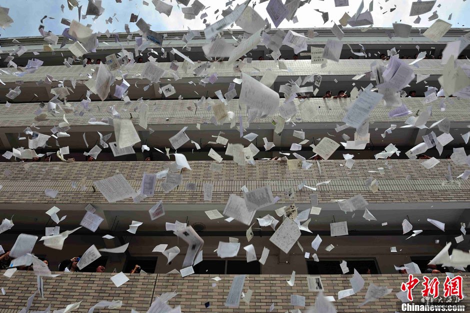 大西北网6月6日讯 高考前,安徽省六安市毛坦厂镇毛坦厂中学高三毕业班学生“撕书狂欢”,漫天纸屑飞雪一般落