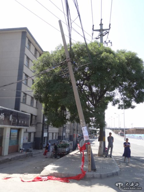 6月5日,小西湖北街一根倾斜的电杆被附近居民挂上了危险标志,请勿靠近。记者在现场看到:电杆倾斜已近30度,电杆底部部分已断裂,杆上还挂着电缆,十分危险,请相关单位尽快到现场处理,排除隐患,保证公众安全。