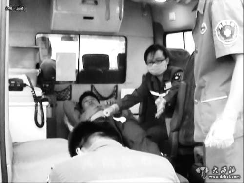 昨日上午,大河报记者在郑州市陇海路与京广路交叉口南侧看到,一辆号牌为豫AA3718的公交车停在路边,车上挤满乘客,急救车和警车停在现场。受伤的董先生正躺在急救车内接受治疗,他穿着一条深色西裤,裤裆正面被割开一道十多厘米长的口子,周围沾满了血迹。急救车上,女大夫正为他处理伤口,董先生一手羞愧地捂着脸,一手攥紧拳头,疼得直咬牙。