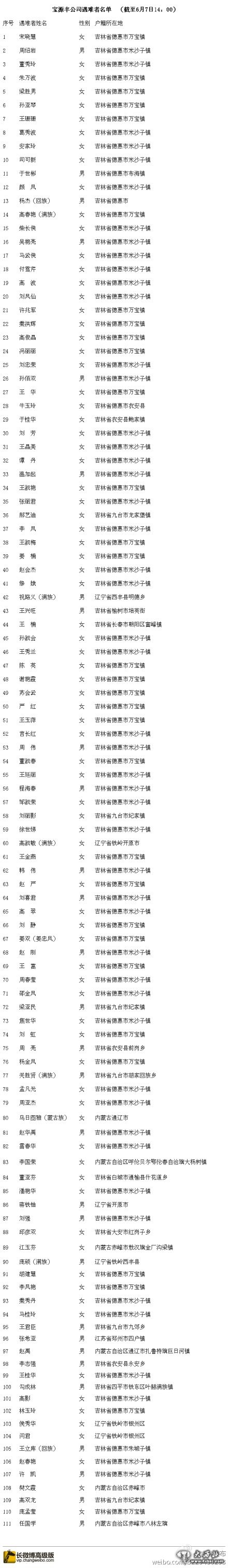 吉林发布:#特别播报#今天下午,宝源丰禽业有限公司事故救援指挥部召开第六次新闻发布会,公布了111位遇难者名单(截至6月7日14时),尚有8名遇难者的DNA比对正在进行中,另外1名由于家属没有前来登记,暂时无法进行DNA比对。遇难者名单详见长微博。
