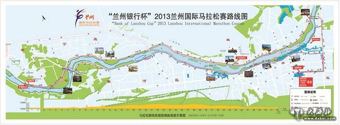 (起点)兰州市东方红广场(向东)→东岗西路→盘旋路十字(左转 向北)→天水中路→雁滩桥十字→雁滩公园→天水北路→(左转)雁滩黄河大桥(过桥 右转下桥)→( 向西)北滨河东路→甘肃大剧院(会展中心)→北滨河东路→城关黄河大桥(北侧桥下穿过)→北滨河东路(黄河音乐喷泉)→市二院→百年中山铁桥(桥北)→白塔山→北滨河东路→金城关(小马拉松终点)→龙源→小西湖立交桥(桥北靠黄河侧穿过)→北滨河中路→七里河黄河大桥(北侧桥下穿过)→安宁庭院→北滨河西路→生命之源(雕塑)→省委党校→银滩黄河大桥(北侧桥下穿过)→北滨河西路(银滩湿地公园)→甘农大→21公里(转折点 ●)→(过21公里?向西+97.5米半程马拉松终点)→甘农大→北滨河西路(银滩湿地公园)→银滩黄河大桥西侧(左转上西侧引道)→银滩黄河大桥西侧引道绿化带右转→(上 )银滩黄河大桥(过桥到七里河区)→(进入 )马滩文化岛700米(折回)→(下 )银滩黄河大桥七里河段东引道→(右转?向西)南滨河中路→兰州卷烟厂→百合公园→南滨河中路→七里河黄河大桥(桥南 桥下穿过)→吴家园→陆军总院→南滨河中路→小西湖立交桥(桥南?桥下穿过)→南滨河中路→黄河母亲(雕塑)→小西湖公园→水车园→百年中山铁桥(桥南)→兰州港→南滨河东路→市委→博浪(雕塑)→市政府(市民公园)→南滨河东路→平沙落雁(雕塑)→读者大道→雁滩桥十字(右转 向南)→天水中路→盘旋路十字(右转 向西)→东岗西路→东方红广场(终点)。