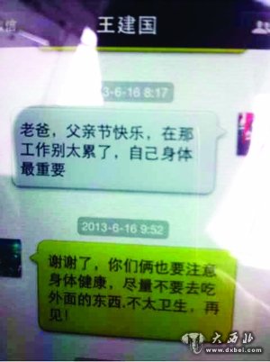 在王泽俊的手机里,保存着他和父亲王建国的微信记录。6月16日父亲节当天早上8点多,王泽俊给爸爸王建国发了一条微信:老爸,父亲节快乐,在那工作别太累了,自己身体最重要。王建国也在微信中叮嘱儿子和儿媳,要注意身体,尽量少去外面吃东西,担心不卫生。