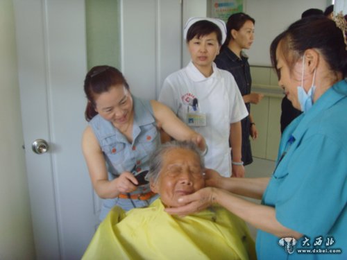 一位瘫痪在床的老人,缠身的疾病让她不时的发出断断续续地呻吟,由于头部不能直立,在一女护工的双手搀扶老人头部的辅助下,剪发工作得以进行,尽管躺在轮椅上的剪发工作很是艰难,但付庭梅还是保持着一贯的笑容,不时的弯腰侧身,将老人的发型收拾得干练利落。