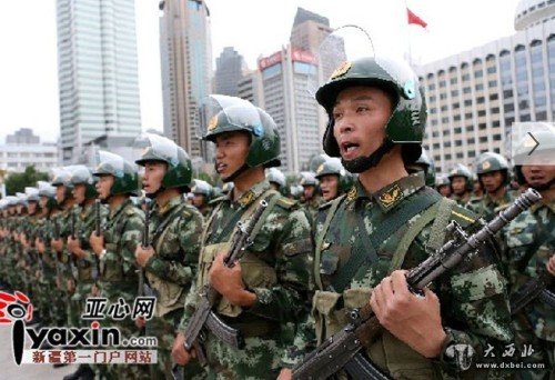 在乌鲁木齐市人民广场、南湖广场上,手执钢枪、英姿飒爽的武警部队官兵列队挺立,“听党指挥,英勇顽强,不怕牺牲,坚决打击暴力恐怖活动……”铿锵激越的宣誓声,在广场上空回响。直升机在空中飞翔,一辆辆军车、装甲车排列待发。