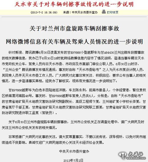 广大网民对此事非常关注,要求官方公布当事人的相关情况,进一步澄清事实真相。天水市委外宣办今日发表公告,有关情况做了进一步的说明。公告称,甘E97666越野车为白色丰田陆地巡洋舰,车主陈永利,陇南市徽县人,个体经营者,暂住麦积区桥南渭河南路46号。事发时,甘E97666越野车驾乘人员共5人,分别是:自称“天水市委秘书”的甘肃省地矿局天水地质灾害防治研究院副院长、高级工程师卞某,兰州地矿某小学校长李某,甘肃省某厅干部王某,甘肃省地矿局天水地质灾害防治研究院职工郭某,甘肃省地矿局天水地质灾害防治研究院退休职工孟某(驾驶员)。