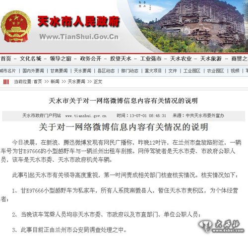 人民网北京7月2日电 近日,在新浪、腾迅微博发现有网民广播称,6月30日12时许,在兰州市盘旋路附近,一辆车号为甘E97666的小型越野车与一辆兰州出租车刮擦。据传驾驶者是天水市委、市政府公职人员,该车是天水市委、天水市政府机关车辆。6月30日21时许,“兰州公安”在腾讯微博发布情况通报,通报表示事发时自称“天水市委秘书”之人为天水市某设计院人员,其同乘人员并无天水市委工作人员。