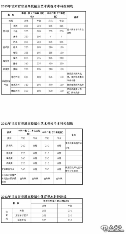 鑫报讯 省招办昨日公布了2013年甘肃省普通高校招生艺术类统考本科控制线。今年,各科类专业课分数线与去年相比变化不大,部分科目文化课分数线略有下降。