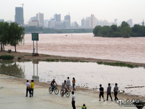 7月8日,兰州市一些市民在近水广场散步、游玩,由于连日的降雨,黄河水位上涨,进水广场一大半被淹。