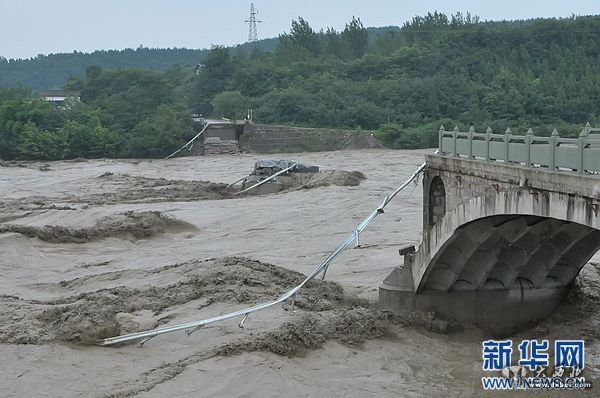 7月9日在四川绵阳江油市拍摄的老青莲大桥垮塌事故现场。当日11时许,因持续暴雨引发洪水,四川江油市通往绵阳的绵江公路通口河老青莲大桥被冲垮,有车辆和行人落水。记者了解到,这座大桥在当地已有数十年历史,汶川地震后经过维修加固,但因洪水来势凶猛,水流太大而垮塌。目前有2名落水行人被当地玖岭镇农民救起,现场正全力展开救援,具体伤亡情况仍待统计。新华社发
