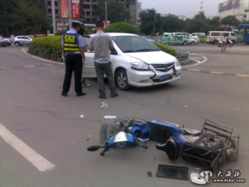 昨日中午12时许,盘旋路兰州饭店门前发生一起交通事故,一辆小轿车撞飞一辆摩托车,所幸未造成人员伤亡。记者在现场看到,摩托车被白色小车撞飞后,倒在马路上,小车头部严重受损。