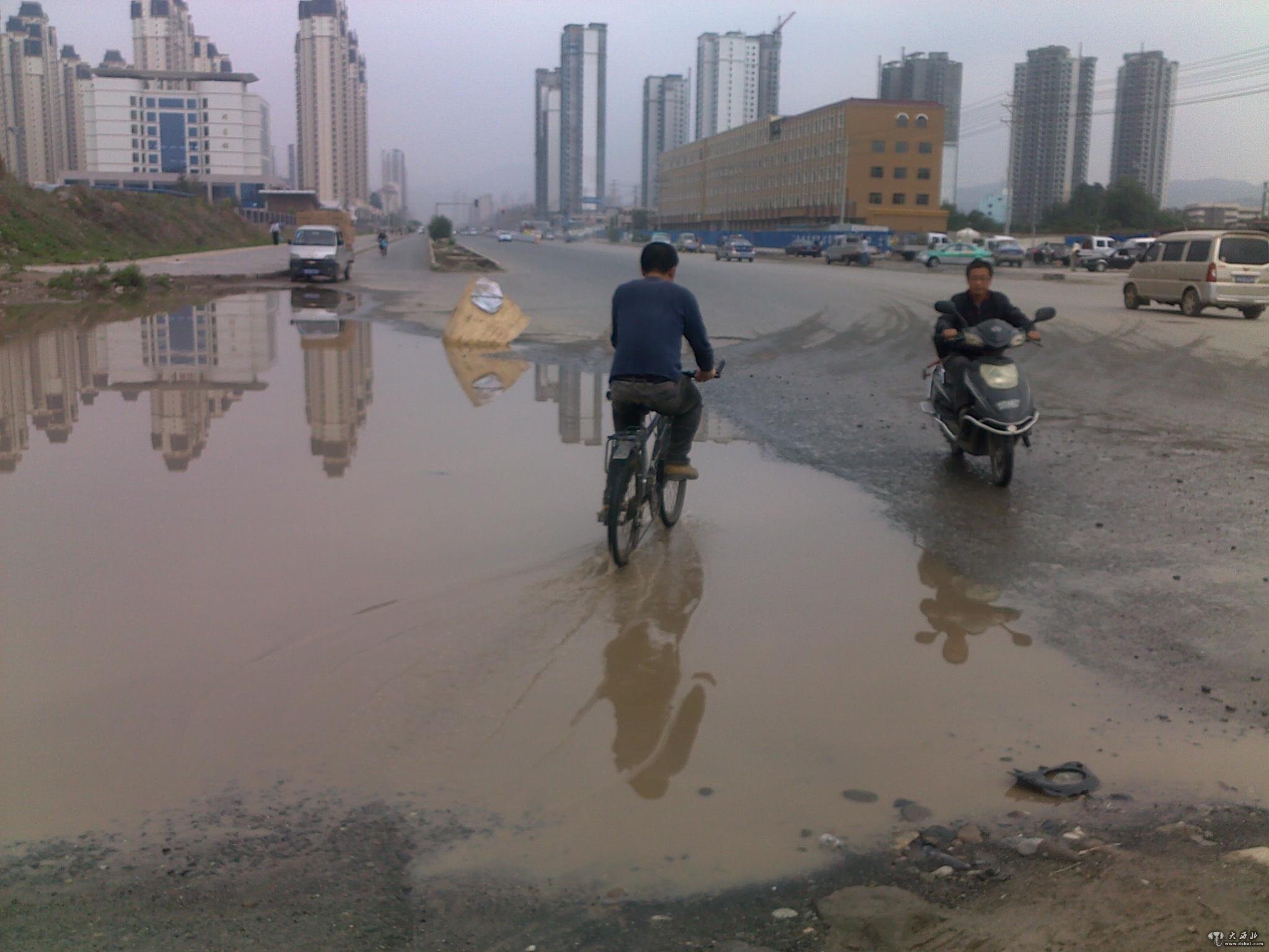 大西北网7月14日讯 连日的阴雨天气,让雁滩的多处路段严重积水,不但阻碍了交通,也为路人行走带来很大的不便。昨日,家住北面滩的刘先生反映,位于北面滩兰州文理学院南侧有一条马路至今未修,马路上积水流到丁字路口成了“积水坑”,导致上下班高峰时堵车十分严重,居民们希望早点修好那段“难心路”。